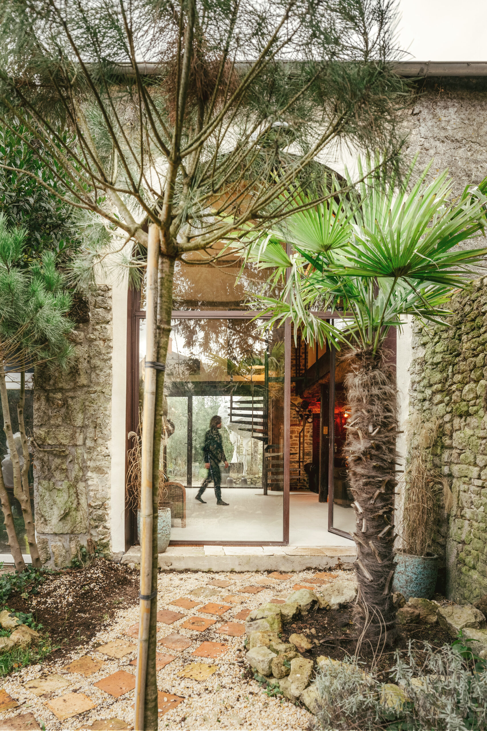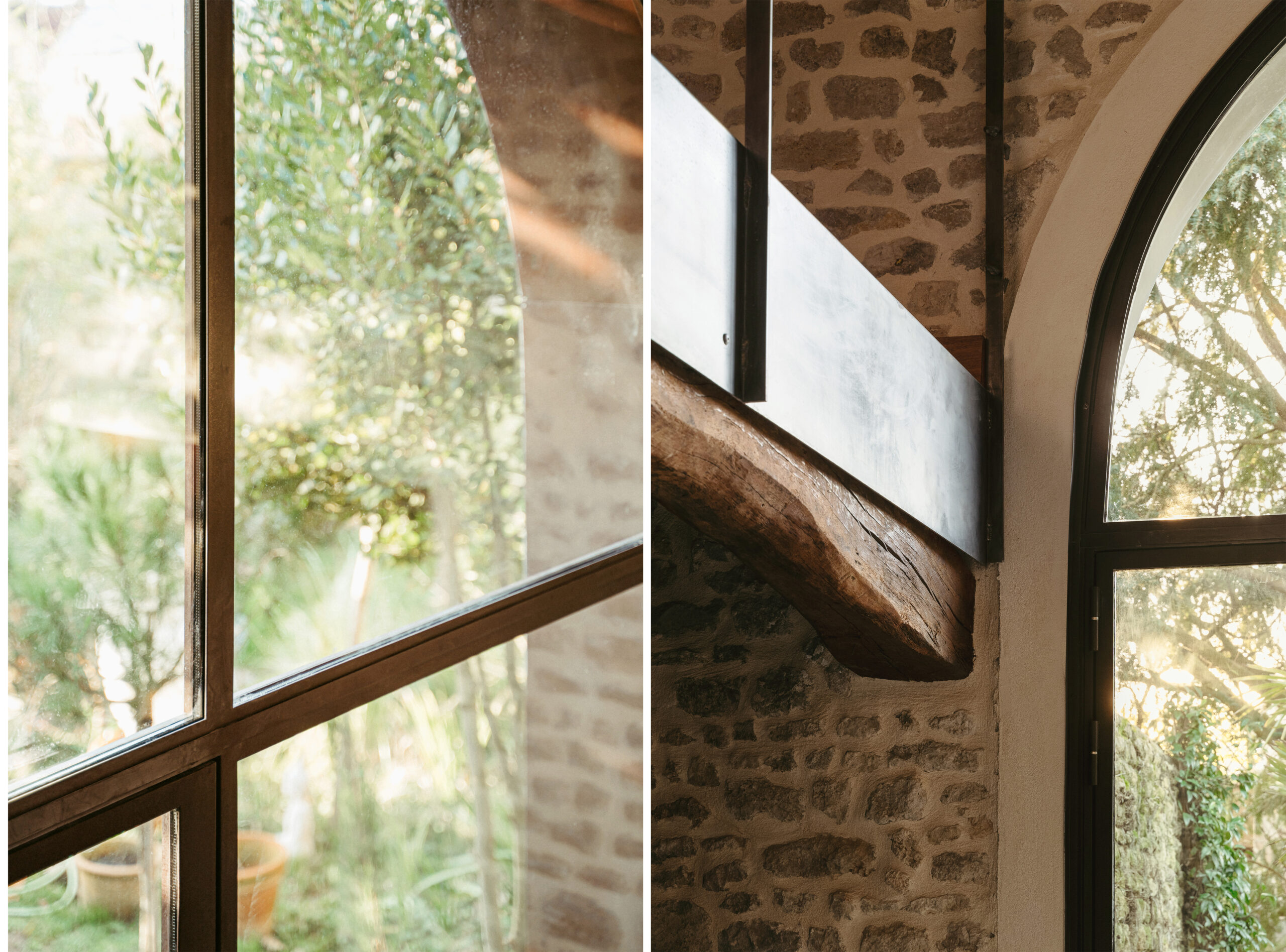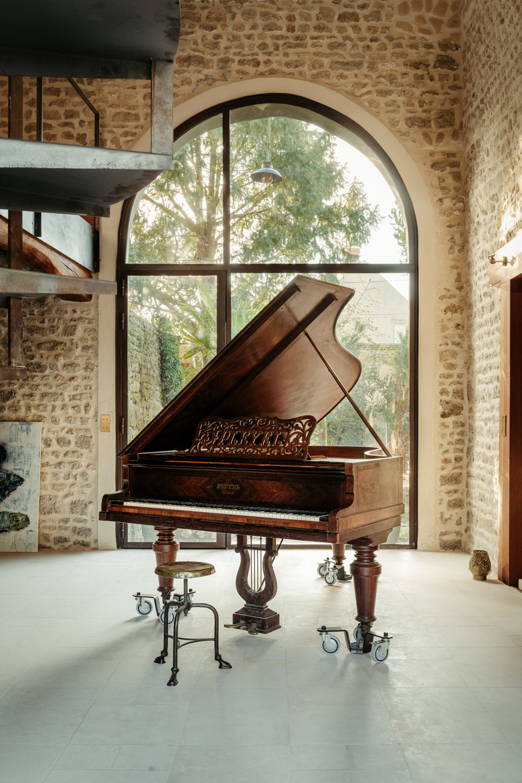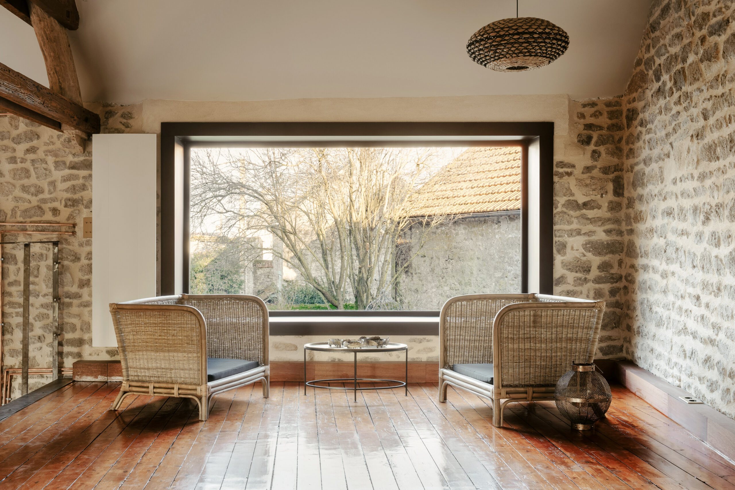 Restructuration d’une grange mitoyenne abandonnée en cœur de village, laissant place à un espace dédié à la musique et un salon en mezzanine. D’origine la bâtisse était divisée en deux étages, séparée par un grenier. La moitié du plancher a été retirée pour créer une double hauteur tout en réutilisant les matériaux déposés pour un projet d’annexe: la récupération du plancher bois et de certaines anciennes fenêtres a servi à la fabrication de cet atelier de peinture dans l’esprit d’un cabanon. Le traitement architectural sur la grange fait référence à l’ancienne utilisation du lieu pour l’agriculture et notamment le passage des machines, d’où la création des grandes ouvertures en face de l’ancienne double porte en bois pour l’accès des tracteurs. Ces percements permettent aux deux jardins de part et d’autres de dialoguer en ouvrant des vues sur le paysage. La serrurerie et la métallerie ont intentionnellement été conçues avec des aciers de faible épaisseur pour effacer les interventions contemporaines sur la construction et conserver au mieux le caractère de la pierre sèche apparente des façades.