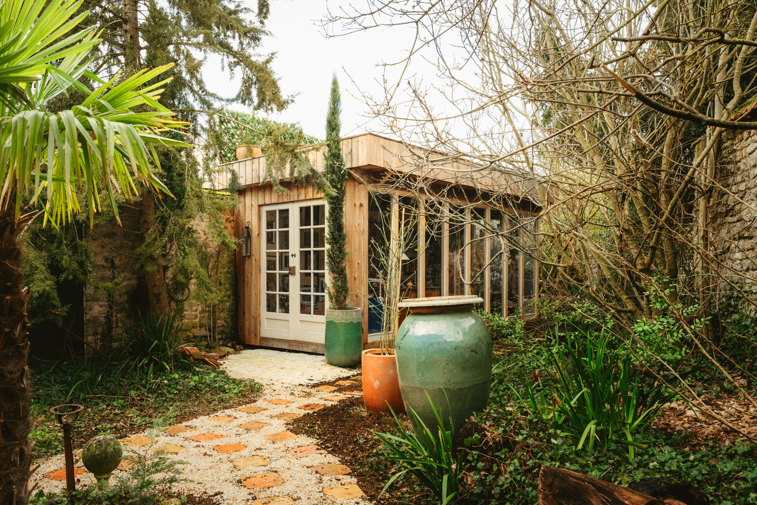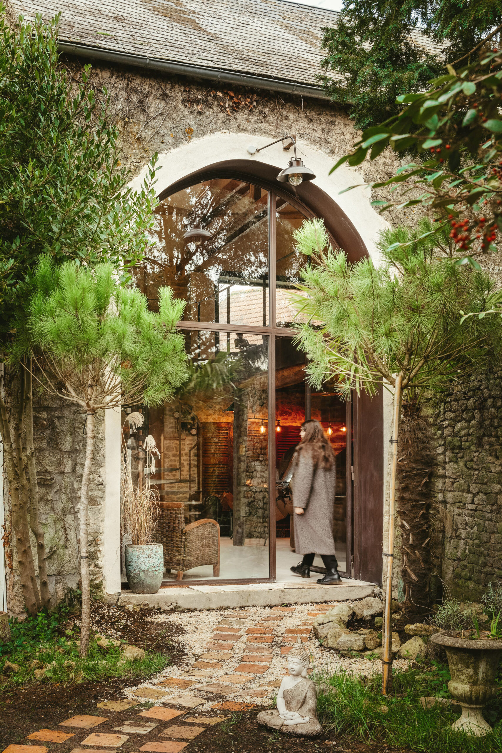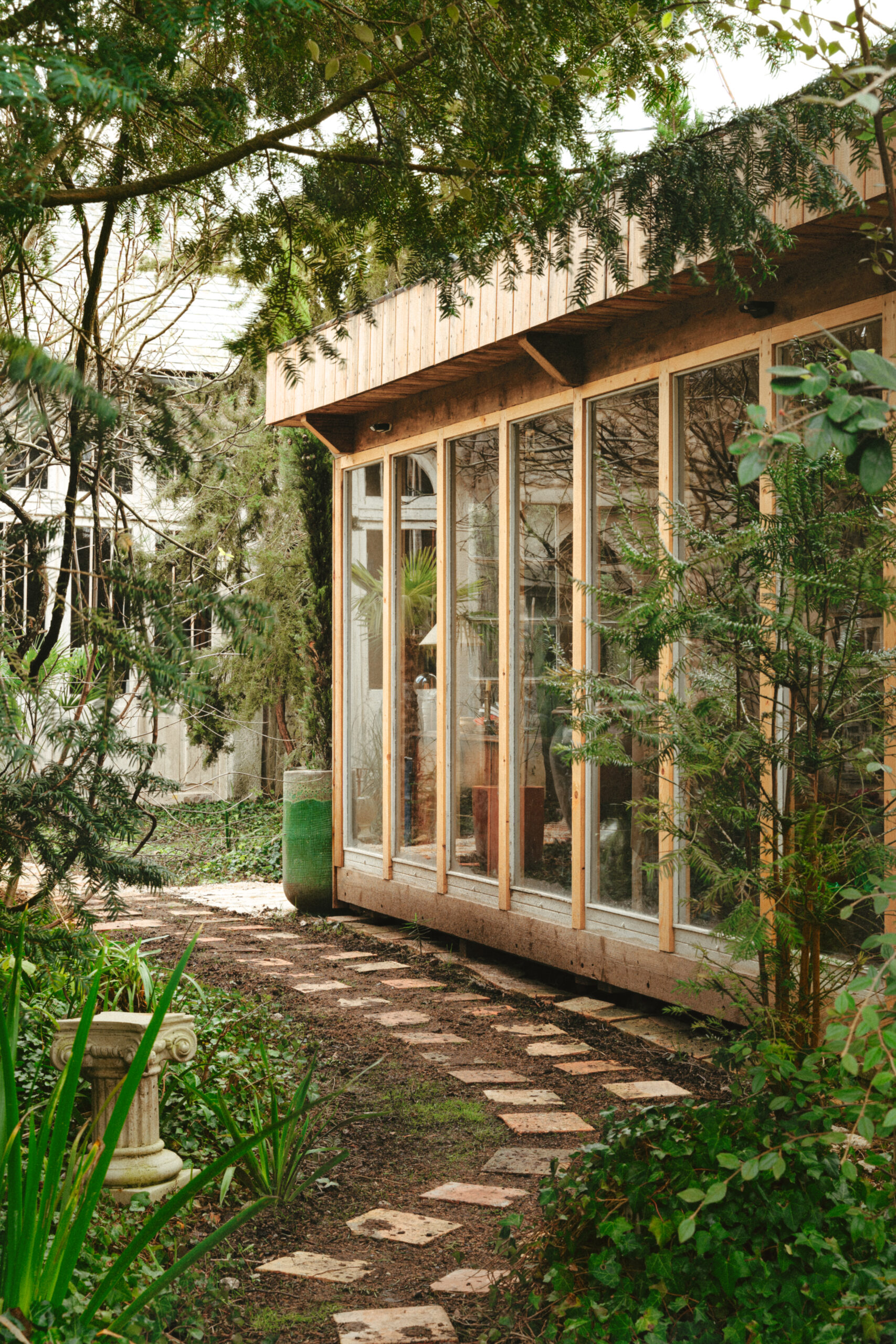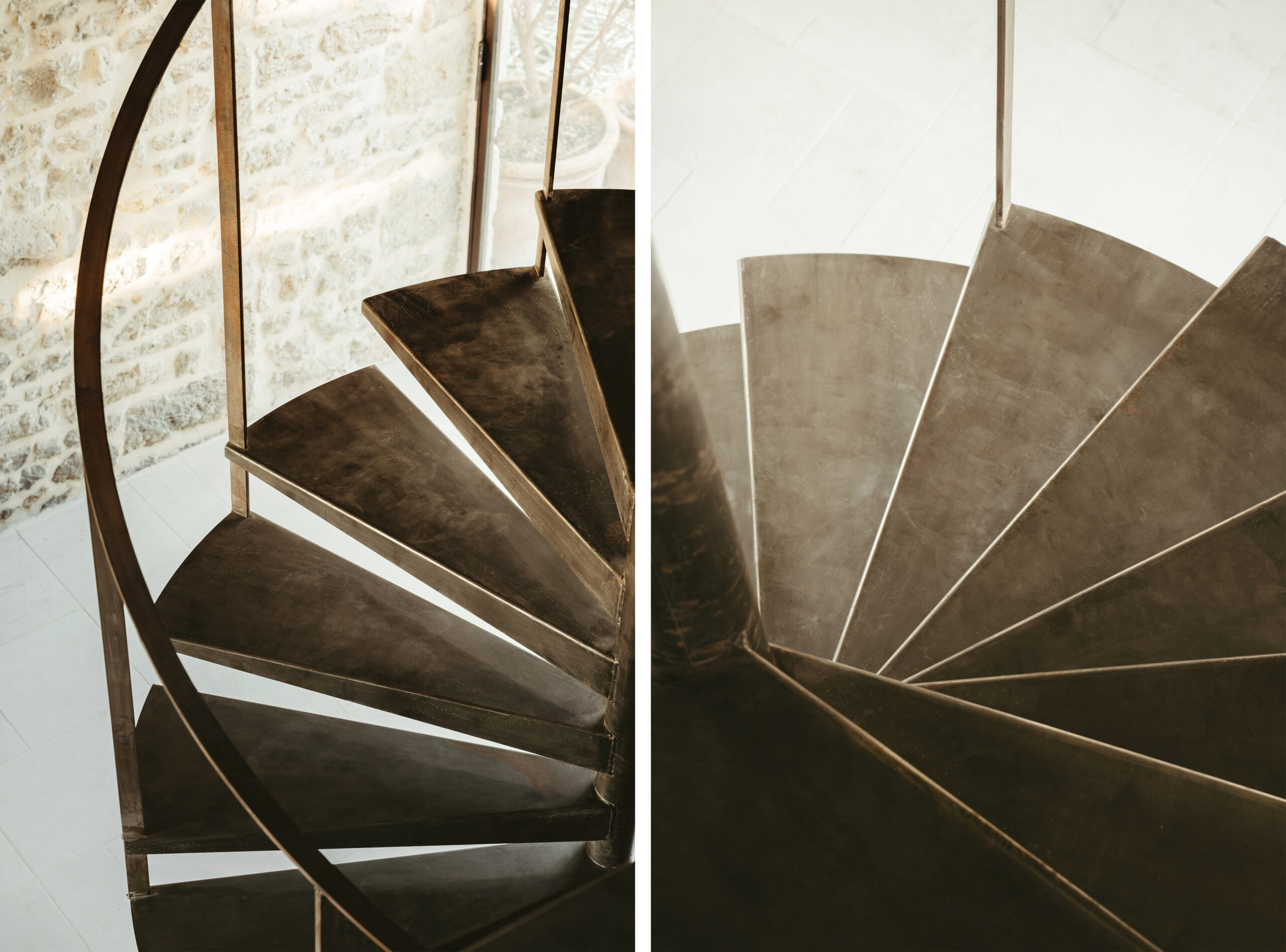 Restructuration d’une grange mitoyenne abandonnée en cœur de village, laissant place à un espace dédié à la musique et un salon en mezzanine. D’origine la bâtisse était divisée en deux étages, séparée par un grenier. La moitié du plancher a été retirée pour créer une double hauteur tout en réutilisant les matériaux déposés pour un projet d’annexe: la récupération du plancher bois et de certaines anciennes fenêtres a servi à la fabrication de cet atelier de peinture dans l’esprit d’un cabanon. Le traitement architectural sur la grange fait référence à l’ancienne utilisation du lieu pour l’agriculture et notamment le passage des machines, d’où la création des grandes ouvertures en face de l’ancienne double porte en bois pour l’accès des tracteurs. Ces percements permettent aux deux jardins de part et d’autres de dialoguer en ouvrant des vues sur le paysage. La serrurerie et la métallerie ont intentionnellement été conçues avec des aciers de faible épaisseur pour effacer les interventions contemporaines sur la construction et conserver au mieux le caractère de la pierre sèche apparente des façades.