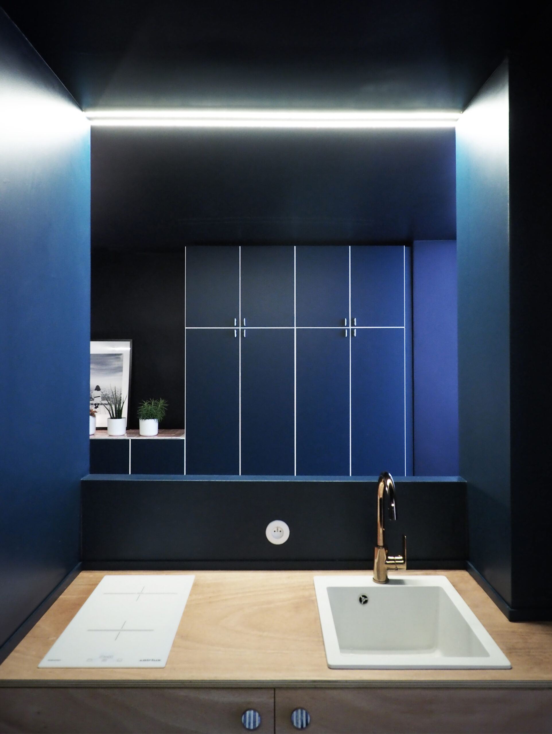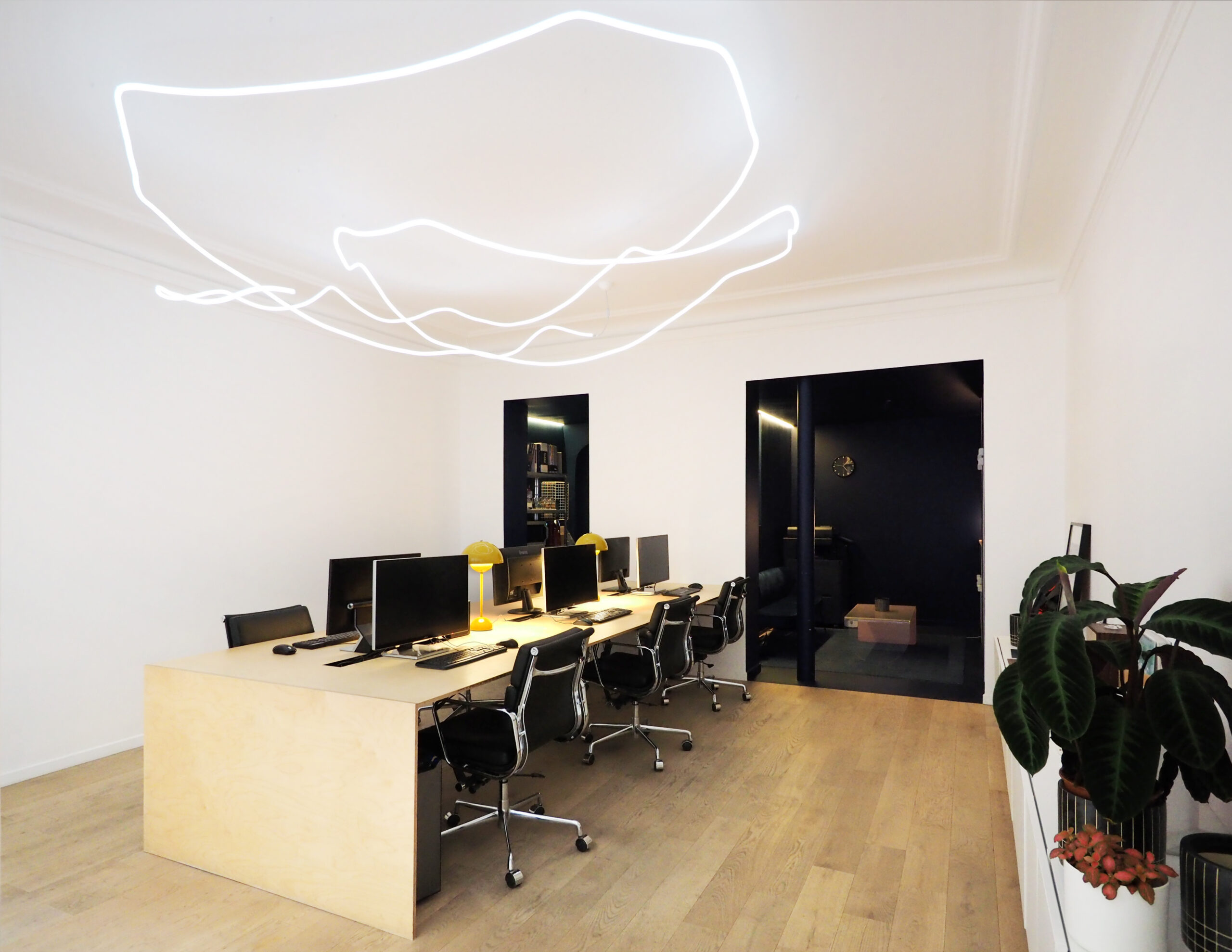 Aménagement d’un ancien restaurant en bureaux, avec conservation de la façade existante en rez-de-chaussée sur rue. Cette transparence sur la rue propose au passant une mise en scène du travail, avec la création d’ une table centrale sans pieds, éclairée par un tube lumineux flottant au plafond. Les fonctions techniques sont dissimulées dans les renfoncements sombres de part et d’autre de la table. Le bleu Luzien contraste avec la salle blanche et lumineuse du premier plan. Cet espace abrite une cuisine, des sanitaires, une salle de réunion et de reprographie.